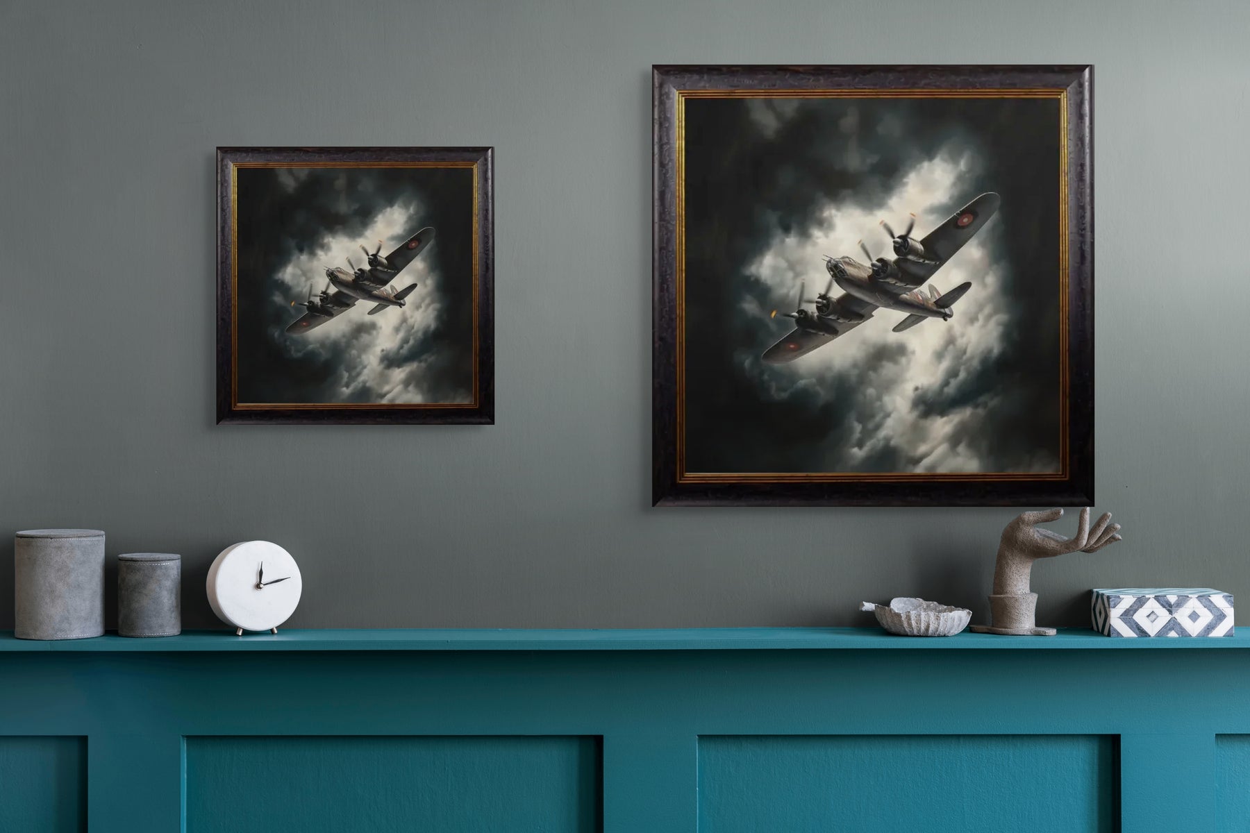 This striking artwork captures the legendary Lancaster Bomber soaring through dramatic skies, a powerful tribute to one of the most iconic aircraft of the Second World War. The detail and atmosphere make it a commanding piece, perfect for aviation enthusiasts and history admirers alike.
