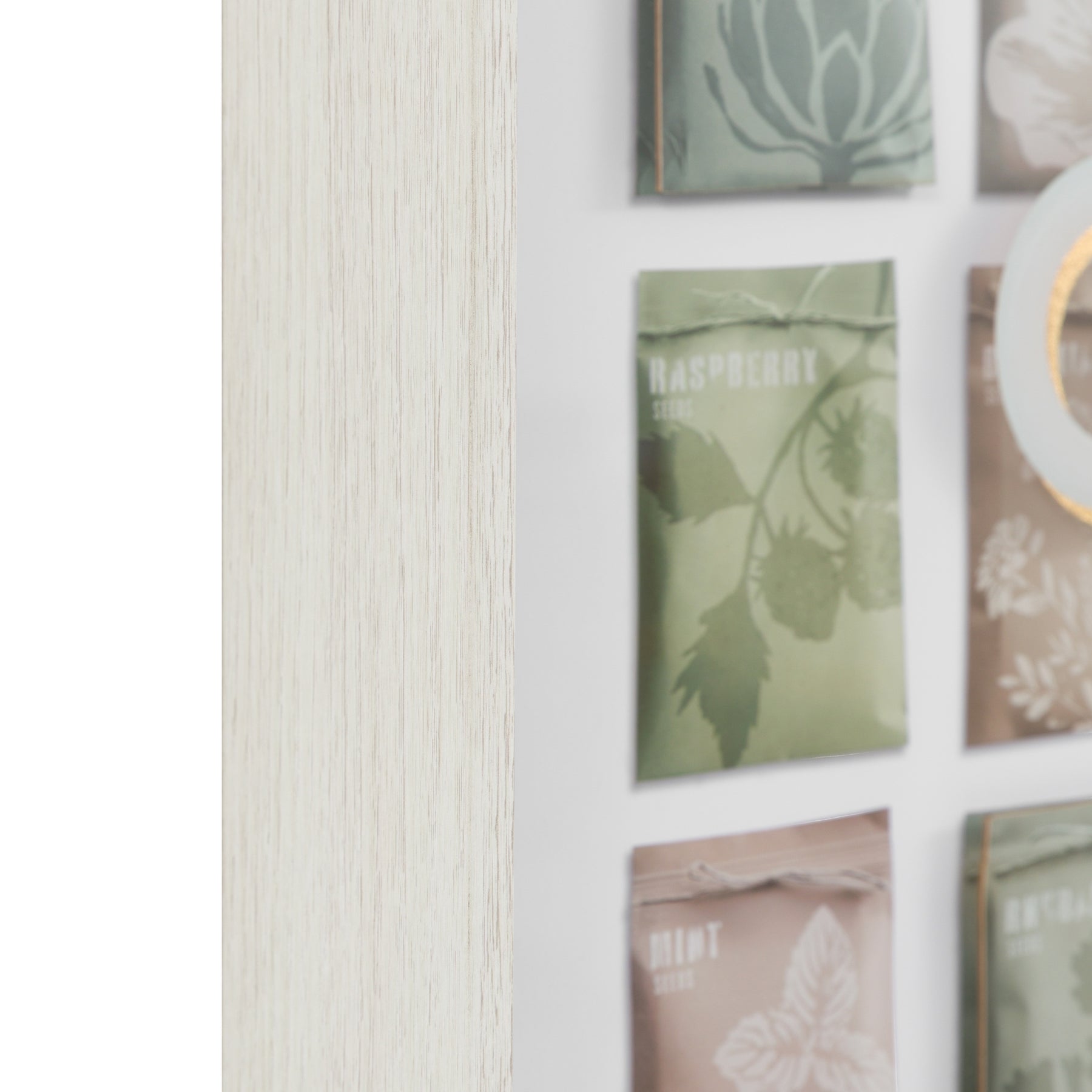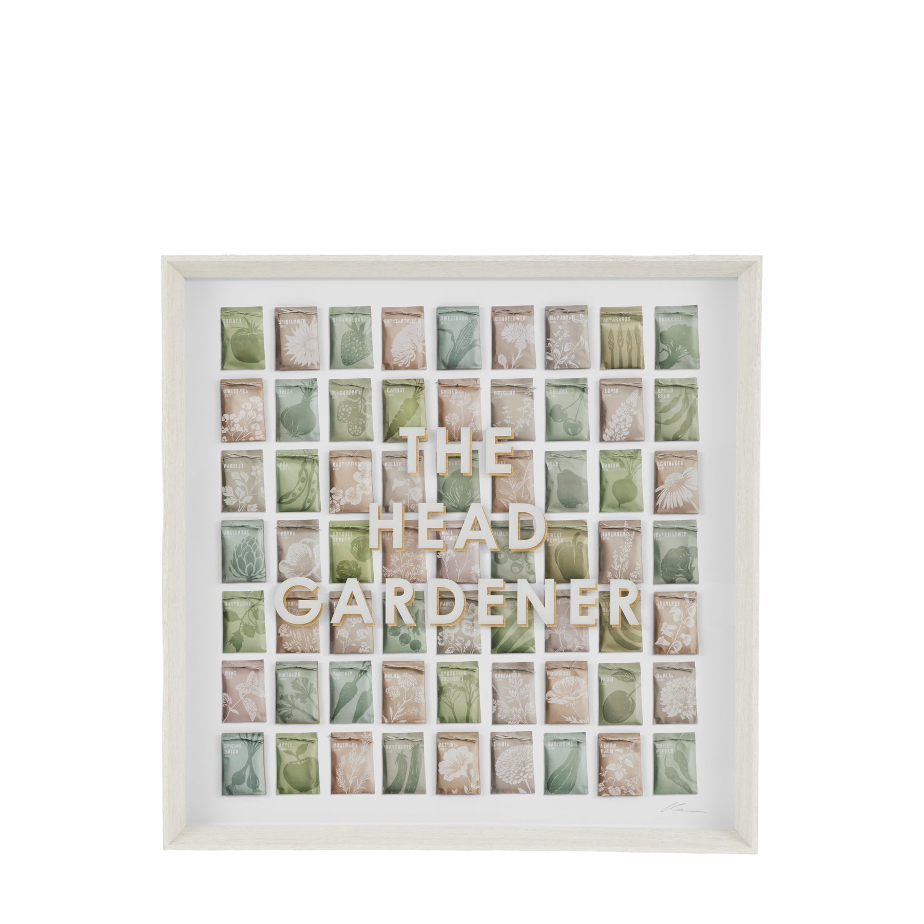 In this playful mixed-media work, the artist has arranged vintage seed packets in soft, muted greens and browns to celebrate the art of gardening. Overlaid with the phrase 'The Head Gardener' silkscreened in white and gold foil onto the glass, the piece combines nostalgia, humour and craftsmanship in a tribute to nature's quiet creativity.